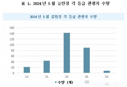 길림성은 8개의 지방 시와 1개의 자치주를 관할한다. 그중 A급 관광지가 가장 많은 곳은 통화시이며, 2024년 5월 기준 A급 관광지 수는 62개에 달한다. 길림성 통화시의 관광 특색은 주로 풍부한 문화 유산, 자연 경관, 빙설 스포츠, 혁명 유적 관광 등이 있다. A급 관광지 수에서 두 번째로 많은 곳은 연변 조선족 자치주로, A급 관광지 56개를 보유하고 있으며, 그중 대표적인 곳은 장백산 관광지이다.