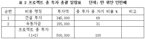 프로젝트 총 투자는 500,000 만 위안이며, 그 중 건설 투자는 345,000 만 위안, 유동 자금은 155,000만 위안이다.