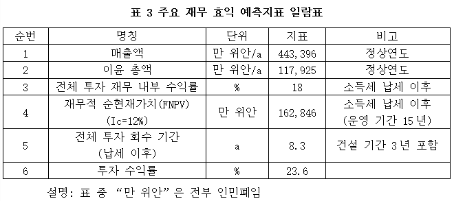 프로젝트 가동 후, 연 평균 매출액 443,396만 위안, 이윤은 117,925만 위안, 투자 회수 기간 8.3년(납세 이후, 건설 기간 3년 포함),투자 수익률은 23.6 %이다.