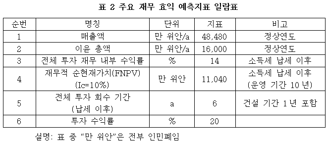 프로젝트가 설계 생산 능력의 생산량에 도달한 후, 연 평균 매출액 48,480만 위안, 이윤은 16,000만 위안, 투자 회수 기간 6년(납세 이후, 건설 기간 1년 포함),투자 수익률은 20 %이다.