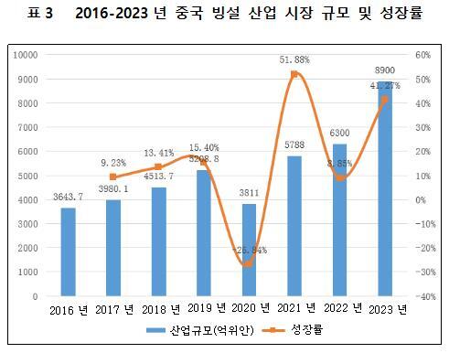 2016년부터 2019년까지 중국 빙설 산업 시장 규모는 매년 증가하였으나 팬데믹의 영향으로 2020년 빙설 산업 규모는 3,811억 위안으로 감소하였다. 2021년 중국 빙설 산업은 점차 회복되어 시장 규모가 5,788억 위안에 달하며 전년 대비 51.88% 증가하였고 2022년 산업 규모는 6,300억 위안이었다. 팬데믹 통제가 완화됨에 따라 중국 빙설 관광 소비는 빠른 성장세를 유지하며 빙설 관광이 “있느냐 없느냐”에서 “좋느냐 나쁘냐”로 변화하고 있다. 2023년 중국 빙설 산업 시장 규모는 8,900억 위안에 달하였고, 2024년에는 9,700억 위안에 달하였으며 2025년에는 10,000억 위안을 돌파하여 10,053억 위안에 이를 것으로 예상한다.