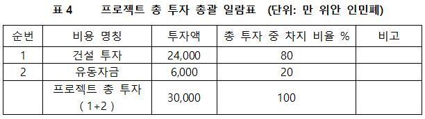 본 프로젝트의 총 투자는 30,000만 위안이며, 그 중: 건설 투자가 24,000만 위안, 유동 자금은 6,000만 위안이다.