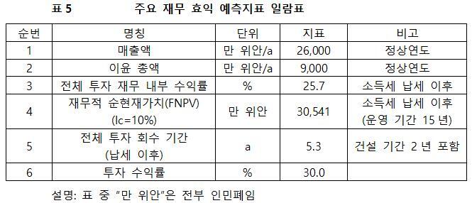 프로젝트가 설계 생산 능력의 생산량에 도달한 후, 연 평균 매출액 26,000만 위안, 이윤 9,000만 위안, 투자회수기 5.3년 (납세 이후, 건설기간 2년 포함), 투자 수익률 30.0%.
