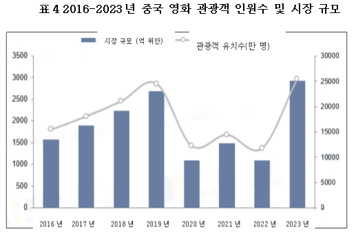 2020년 이후, 국내의 관광 및 영화 산업 발전은 정체기에 들어갔다. 우리나라 문화 부문 및 정부 부문은 영화 문화 관광 산업 발전에 충분한 지원을 제공하여 영화 관광업이 다시 활기를 띠게 했다. 통계에 따르면, 2023년 중국 영화 관광 시장 규모는 2,933.2억 위안에 달했고, 관광객 수는 25,390만 명을 기록하며, 각각 전년 대비 168.2%, 115.7% 증가했다.
