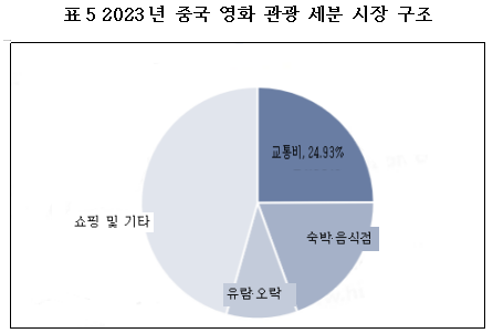 영화 관광 산업은 영화 제작과 관광 자원을 결합한 새로운 분야로, 영화 작품, 프로그램 및 행사 등을 통해 관객과 관광객을 유치하고 관광업의 발전을 촉진한다. 2023년 우리나라 영화 관광 시장 규모는 약 2,933.2억 위안으로, 세부 시장 구성을 보면 교통 비용 규모가 가장 큰 비중을 차지하며 24.93%를 기록했고, 그 다음으로 숙박과 요식업이 19.53%를 차지했다.