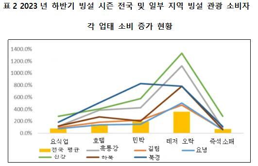 관광업은 종합적인 견인 효과가 강한 산업이다. 빙설 관광 레저는 “빙설 풍경, 빙설 스포츠” 등을 핵심 매력 요소로 삼고 있지만, 최근의 빠른 발전은 관광 목적지의 식음료, 숙박, 오락, 레저, 쇼핑 등 다양한 소비 업태의 상호 융합과 떼려야 뗄 수 없는 관계에 있다. 메이퇀 데이터에 따르면, 2023년 하반기 빙설 시즌 동안 전국 원격 관광객의 식음료, 호텔, 민박, 레저 오락, 즉시 소매 등 업태에서의 소비 규모는 각각 전년 동기 대비 76.4%, 146.8%, 196.5%, 356.6%, 65.7% 증가했다. 특히 흑룡강, 길림, 요녕, 신장(新疆), 하북, 베이징 등 인기 있는 빙설 관광 목적지에서는 위의 여러 업태에서의 소비 규모 증가율이 전국 평균을 상회했으며, 그중 신장 위구르 자치구 (新疆维吾尔自治区)는 이들 업태의 평균 증가율이 570%를 넘었고, 흑룡강은 평균 증가율이 420%를 넘어 업태 다양성과 소비 융합 수준이 지역 관광 발전에 얼마나 중요한지를 보여주고 있다.