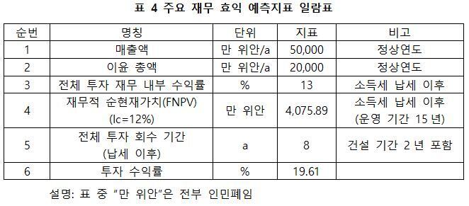 프로젝트가 설계 생산 능력의 생산량에 도달한 후, 연 평균 매출액 50,000만 위안, 이윤 20,000만 위안, 투자 회수기 8년(납세 이후, 건설 기간 2년 포함), 투자 수익률19.61%.
