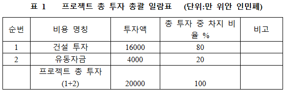 프로젝트의 총 투자는 20,000만 위안이며, 그 중 건설 투자가 16,000만 위안이다.