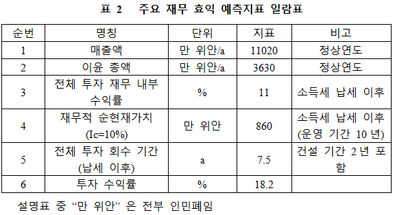 프로젝트가 설계 생산 능력의 생산량에 도달한 후 연간 매출액 11,020만 위안, 이윤 3,630만 위안, 투자 회수 기간 7.5년(납세 이후, 건설 기간 2년 포함), 투자 이익률 18.2%이다.