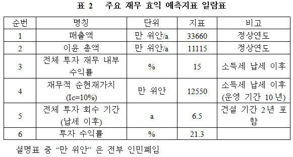 프로젝트가 설계 생산 능력의 생산량에 도달한 후 연간 매출액 33,660만 위안, 이윤 11,115만 위안, 투자 회수 기간 6.5년(납세 이후, 건설 기간 2년 포함), 투자 이익률 21.3%이다.