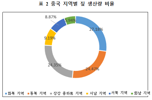 생산량의 관점에서 볼 때 짚 생산량은 화북구, 동북구, 장강 중하류구, 서남구, 서북구, 화남구 순으로 각각 전국 짚 총량의 27.18%, 24.47%, 24.35%, 9.19%, 8.87%, 5.94%를 차지한다.