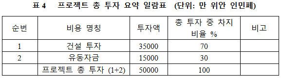 프로젝트의 총 투자는 50,000만 위안이며, 그 중 건설 투자가 35,000만 위안, 유동자금은 15,000만 위안이다.