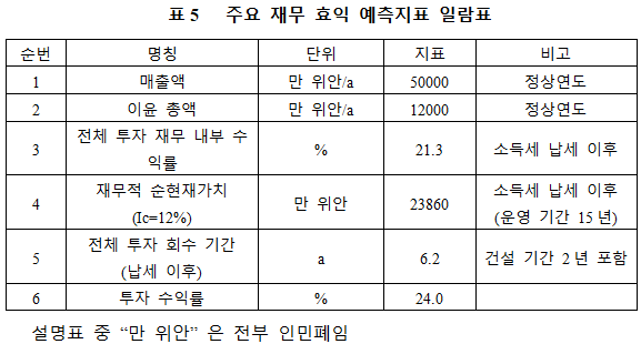 프로젝트가 설계 생산 능력의 생산량에 도달한 후 연간 매출액 50,000만 위안, 이윤 12,000만 위안, 투자 회수 기간 6.2년(납세 이후, 건설 기간 2년 포함), 투자 이익률 24.0%이다.