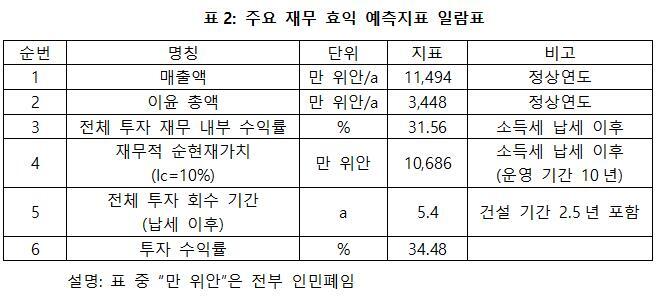 프로젝트가 설계 생산 능력의 생산량에 도달한 후 연간 매출액 11,494만 위안, 이윤 3,448만 위안, 투자 회수 기간 5.4년(납세 이후, 건설 기간 2.5년 포함), 투자 수익률은 34.48%이다.