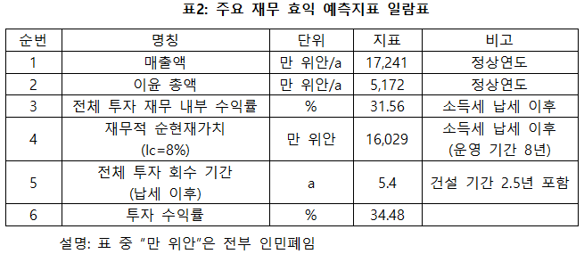 프로젝트가 설계 생산 능력의 생산량에 도달한 후 연간 매출액 17,241만 위안, 이윤 5,172만 위안, 투자 회수 기간 5.4년(납세 이후, 건설 기간 2.5년 포함), 투자 수익률은 34.48%이다.