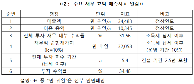 프로젝트가 설계 생산 능력의 생산량에 도달한 후 연간 매출액 34,483만 위안, 이윤 10,345만 위안, 투자 회수 기간 5.4년(납세 이후, 건설 기간 2.5년 포함), 투자 수익률은 34.48%이다.