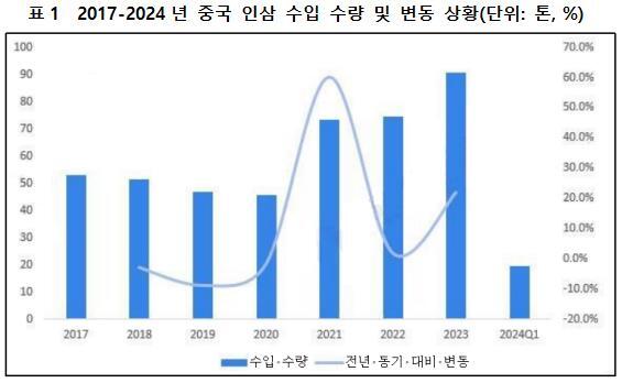 최근 몇 년간 중국의 인삼 생산 판매량은 모두 증가 추세를 유지하여, 2021년 중국의 생인삼 생산량은 69,850톤에 달했으며, 이 중 길림이 56.78%, 흑룡강이 28.63%, 요녕이 7.37%를 차지했고, 수요량은 70,031.9톤에 달했다. 가격 추세를 보면, 2014년부터 중국 생인삼 시장 평균 가격이 점차 하락하기 시작하여 2021년 중국 생인삼 시장 평균가격은 121.4위안/킬로그램이었으며, 2023년 중국 생인삼 시장 평균 가격은 약 120.6위안/킬로그램이다.