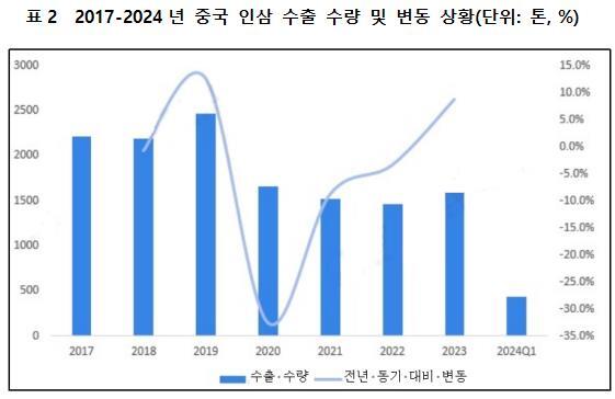 2019-2021년, 전염병 영향으로 중국의 인삼 수출량이 지속적으로 하락하여 2021년에는 최근 몇 년간의 저점에 도달했다. 2022년 이후, 수출이 지속적으로 회복되어 2023년에는 약 2,070톤에 달해 전년 동기 대비 44% 성장했다. 인삼 수출 금액은 전체적으로 W형 추세를 보였다. 2021년은 최근 몇 년간의 저점으로, 수출 금액이 단지 24만 달러였다. 2022-2023년 수출 금액이 지속적으로 상승하여 2023년에는 160만 달러를 초과하여 전년 대비 46% 성장했으며, 2017년 수준으로 회복되었다. 수출 목적지를 보면, 2023년 중국의 인삼 수출은 주로 일본으로, 40% 이상을 차지했으며, 그 다음으로 중국 홍콩과 중국 대만이 각각 23.8%와 16.9%를 차지했고, 기타 지역은 5% 미만을 차지했다. 수출 평균 가격 면에서, 2017-2023년 인삼 수출 평균 가격은 0.5-0.8달러/킬로그램 구간에서 변동했다. 2022년 수출 평균 가격이 소폭 상승하여 2023년에는 약 0.85달러/킬로그램이었지만, 전체적으로 볼 때 상대적으로 안정적이다. 결과적으로 중국의 인삼 수출은 수량이 먼저 감소했다가 후에 증가하는 모습을 보이며, 2023년에는 회복 추세를 보였다. 수출 대상을 보면, 중국의 약 40%의 인삼이 일본으로 수출되며, 수출 평균 가격은 상대적으로 안정적이다. 장기적으로 볼 때, 중국 국내 기업의 인삼 소비품 연구개발과 함께 대외 수출 인삼 제품 종류의 부가가치가 지속적으로 상승하여, 중국의 인삼 수출 수량과 수출 금액이 확대될 것으로 기대된다.
