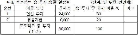 프로젝트의 총 투자는 30,000만 위안이며, 그 중 건설 투자가 24,000만 위안, 유동자금이 6,000만 위안이다.