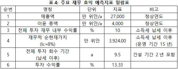 프로젝트가 설계 생산 능력의 생산량에 도달한 후 연간 매출액 27,000만 위안, 이윤 4,000만 위안, 투자 회수 기간 9.5년(납세 이후, 건설 기간 2년 포함), 투자 수익률은 13.33%이다.