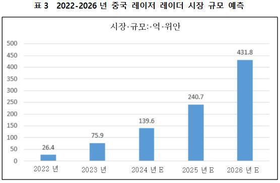 자율주행 차량 규모 확장, 고급 주행 보조 시스템에서의 레이저 레이더 응용 침투율 향상, 로봇 및 스마트 시티 건설 등 분야의 수요 촉진으로 인해 중국 레이저 레이더 시장은 빠른 발전 궤도에 올랐다. 2023년 중국 레이저 레이더 시장 규모는 약 75.9억 위안이었다. 2026년에는 431.8억 위안에 달할 것으로 예상된다.