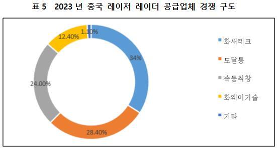 2023년 레이저 레이더 산업의 시장 집중도는 상당히 높았으며, 산업 경쟁이 치열했다. 상위 기업 중 HSAI테크(禾賽科技)는 34%의 시장 점유율로 레이저 레이더 산업에서 선두를 유지했으며, 도달통(圖達通)은 니오자동차의 지속적인 출하에 힘입어 28.4%의 시장 점유율로 2위를 차지했다. 또한, 속등취창(速騰聚創)과 화웨이기술의 시장 점유율은 각각 24.0%, 12.4%였다.