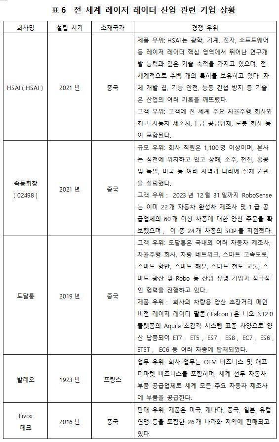 기업 분야에서 전 세계 레이저 레이더 관련 기업으로는 주로 HSAI(HSAI), 속등취창(02498), 도달통, 발레오, Livox테크 등 기업이 있으며, 그 경쟁 우위 비교는 다음과 같다.