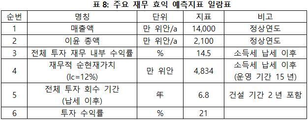 프로젝트가 설계 생산 능력의 생산량에 도달한 후 연간 매출액 14,000만 위안, 이윤 2,100만 위안, 투자 회수 기간 6.8년(납세 이후, 건설 기간 2년 포함), 투자 수익률은 21%이다.