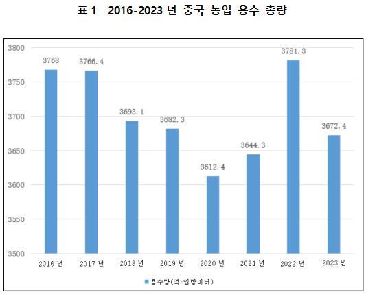 농업 관개는 국민 경제의 “제1 용수 대호(第壹用水大戶)”이자 수자원의 “제1 낭비 대호(第壹浪費大戶)”이기도 하다. 통계에 따르면, 최근 30년간 중국의 농업 관개 연평균 용수량은 기본적으로 약 3,400억 입방미터를 유지하고 있으며, 전체 사회 용수 총량의 약 56%를 차지한다. 2022년, 전국 농업 용수는 3,781.3억 입방미터로, 용수 총량의 63.0%를 차지했으며, 2021년과 비교할 경우 137.0억 입방미터가 증가했다. 2023년 농업 용수 총량은 3,672.4억 입방미터로, 전년보다 다소 감소했으며, 감소량은 108.9억 입방미터였지만, 여전히 전국 용수 총량의 주요 구성 부분으로, 비율이 62.2%에 달했다. 농업 용수 중 경작지 관개 용수량은 농업 용수량의 86%를 차지한다.