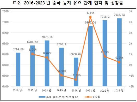 중국은 농업 대국이지만 농업 강국은 아니며, 농업 관개에서 수자원 낭비 사건이 비교적 흔하다. 국토자원부, 수리부, 국가통계국의 통계에 따르면, 관개 측면에서 농지 유효 관개 면적은 2016년 6,714.06만 헥타르에서 2023년의 7,033.33만 헥타르로 상승했으며, 연간 복합 증가율은 0.68%이다.