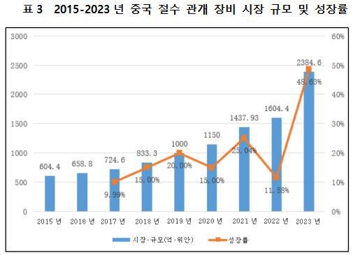 중국 농지 절수 관개 면적이 지속적으로 증가하면서 절수 관개 장비의 신규 및 업데이트 수요가 가속화되고 있다. 국무원, 수리부, 발전개혁위원회 등 주관 부처가 연이어 발표한 <수질 오염 예방 행동 계획>, <수리 개혁 발전 “제13차 5개년” 계획>, <“제14차 5개년” 주요 농업 절수 급수 공정 실시 방안> 등 우호적인 정책 인도 하에, 그리고 주관 부처와 기업의 공동 홍보 작용의 영향 하에, 농민들의 절수 의식이 점차 향상되고, 절수 관개 장비 유지보수, 업데이트 수요가 증가하여 향후 중국 절수 관개 장비 산업 시장 규모는 지속적으로 성장할 것이다. 2015년 중국 절수 관개 장비 산업 시장 규모는 약 604.4억 위안이었으며, 2023년 시장 규모는 2,384.6억 위안으로 증가했고, 연간 복합 성장률은 20.75%에 달했다.