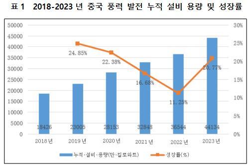 최근 몇 년간 중국의 풍력 발전 설비 용량도 꾸준한 증가 추세를 보이고 있다. 국가에너지국 데이터에 따르면, 2023년 중국의 풍력 발전 누적 설비 용량은 44,134만 킬로와트로 전년 동기 대비 20.77% 성장했다.