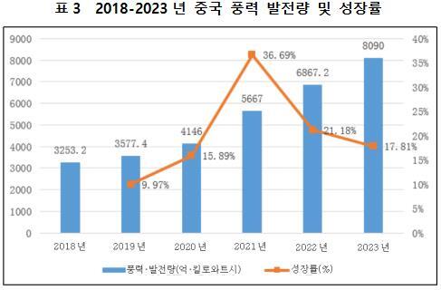 중국은 풍력 발전 기술 연구개발 및 생산 분야에서 지속적으로 투자를 늘리고, 기술 수준과 생산 능력을 향상시켜 이미 세계 선도적인 풍력 발전 제조국이 되었다. 세계 최대 풍력 발전 시장으로서 중국은 육상 및 해상 풍력 발전 모두 큰 잠재력을 갖고 있으며, 최근 몇 년간 발전 속도가 신속하다. 2022년 중국의 풍력 발전량은 6,867.2억 킬로와트시로 전년 동기 대비 21.18% 성장했다. 2023년 전국 풍력 발전량은 8,090억 킬로와트시로 전년 동기 대비 17.81% 성장했다.