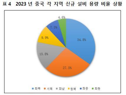 2023년, 전국 6대 지역의 풍력 발전 신규 설비 용량 비율은 각각 화북 34.8%, 서북 27.5%, 화남 15.8%, 동북 9.9%, 화중 7.3%, 화동 4.6%이다. 삼북 지역의 신규 설비 용량 비율은 72%이고, 중동남부 지역의 신규 설비 용량 비율은 28%에 달한다.