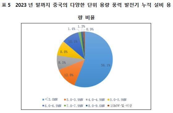 2023년 말까지, 3.0MW 미만(3.0MW을 포함하지 않음) 풍력 발전기 세트의 누적 설비 용량 비율은 2022년의 67.3%에서 56.1%로 하락했다. 3.0MW부터 5.0MW 미만(5.0MW을 포함하지 않음) 풍력 발전기 세트의 누적 설비 용량 비율은 21.3%로, 2022년보다 약 1% 하락했다. 5.0MW 이상 풍력 발전기 세트의 누적 설비 용량 비율은 22.6%에 달해 2022년보다 약 10% 성장했다.