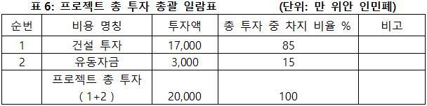 프로젝트의 총 투자는 20,000만 위안이며, 그 중 건설 투자가 17,000만 위안, 유동자금이 3,000만 위안이다.