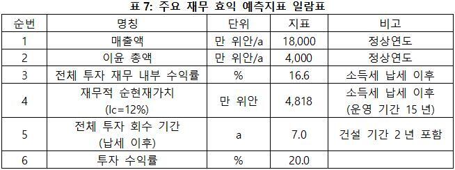 프로젝트가 설계 생산 능력의 생산량에 도달한 후 연간 매출액 18,000만 위안, 이윤 4,000만 위안, 투자 회수 기간 7.0년(납세 이후, 건설 기간 2년 포함), 투자 수익률은 20.0%이다.