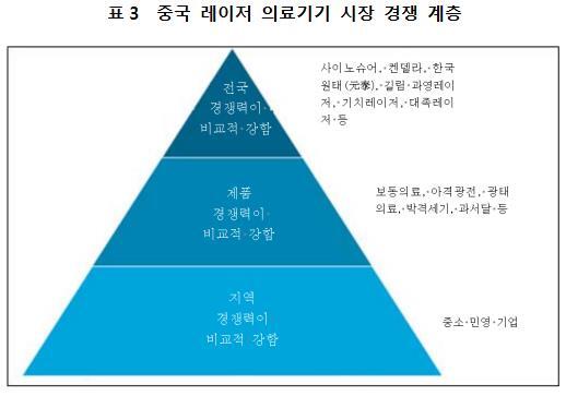 중국 레이저 의료기기 기업의 경쟁 계층에서 제1계층은 중국 시장에서 오랫동안 뿌리내린 외국 기업으로 사이노슈어, 켄델라, 한국 원태(元泰) 등이 있다. 또한 국산 브랜드 경쟁력 측면에서 최근 과영레이저(科英激光), 기치레이저(奇致激光), 대족레이저(大族激光) 등이 브랜드 구축과 시장 개척을 통해 제품 가치를 지속적으로 향상시켜 전국적으로 경쟁력이 강하다. 그 다음으로는 제품 경쟁력이 강한 기업들로 보동의료(普東醫療), 아격광전(亞格光電), 광태의료(光泰醫療), 박격세기(博激世紀), 과서달(科瑞達) 등이 있다. 지역 경쟁력이 강한 기업들은 일부 중소 민영 기업들이다.