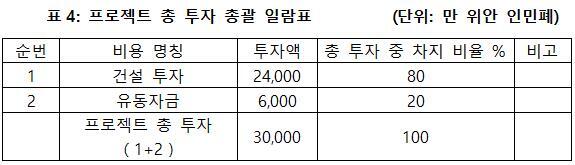 프로젝트의 총 투자는 30,000만 위안이며, 그 중 건설 투자가 24,000만 위안, 유동자금이 6,000만 위안이다.