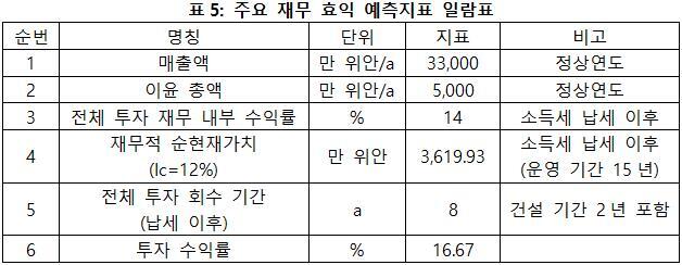 프로젝트가 설계 생산 능력의 생산량에 도달한 후 연간 매출액 33,000만 위안, 이윤 5,000만 위안, 투자 회수 기간 8년(납세 이후, 건설 기간 2년 포함), 투자 수익률은 16.67%이다.