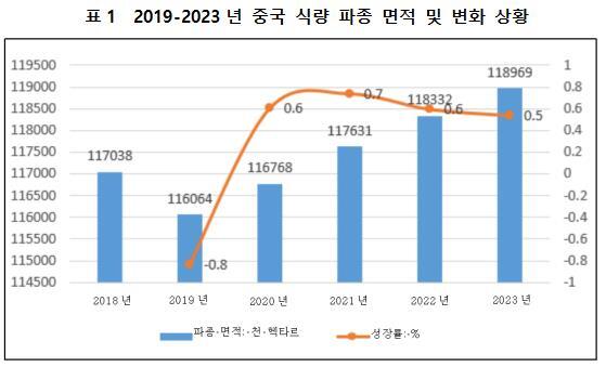 2023년, 전국 식량 파종 면적은 118,969천 헥타르(178,453만 무)로, 2022년 대비 636천 헥타르(955만 무) 증가하여 0.5% 성장했다. 이 중 곡물 파종 면적은 99,926천 헥타르(149,890만 무)로, 2022년 대비 658천 헥타르(986만 무) 증가하여 0.7% 성장했다.