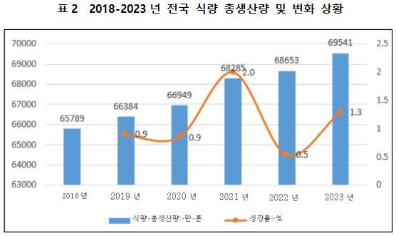 2023년, 전국 식량 총 생산량은 69,541만 톤으로, 2022년 대비 888만 톤 증가하여 1.3% 성장했다. 이 중 곡물 생산량은 64,143만 톤으로, 2022년 대비 819만 톤 증가하여 1.3% 성장했다.
