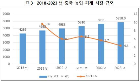 최근 몇 년간, 중국 농업 기계 시장 규모는 지속적으로 확대되었고, 농업 각 산업 발전을 지원하는 기계화 기반이 점차 견고해졌다. 데이터에 따르면, 중국 농업 기계 산업 시장 규모는 2018년의 4,286억 위안에서 2023년에 5,611억 위안으로 증가했으며, 연평균 복합 성장률은 8.4%에 달했다.