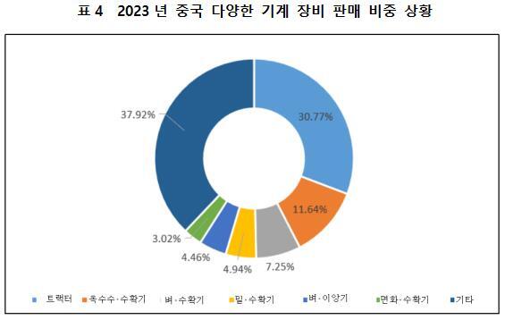 2023년 중국의 다양한 농업 기계 장비 중, 트랙터 판매액 비중이 가장 많아 30.77%를 차지했다. 그 다음으로는 각각 옥수수 수확기, 벼 수확기, 밀 수확기, 벼 이앙기, 면화 수확기로 비중은 각각 11.64%, 7.25%, 4.94%, 4.46%, 3.02%이다.