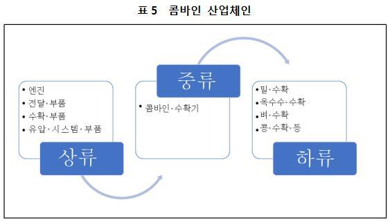 중국 콤바인 산업의 산업체인 구조는 주로 상류의 부품 공급, 중류의 콤바인 제조, 그리고 하류의 응용 분야를 포함한다. 상류 부품에는 엔진, 동력 전달 부품, 수확 부품, 유압 시스템 부품 등이 포함된다. 중류 제조 단계는 연구 개발 설계, 생산 제조, 판매 및 서비스 등을 포함한다. 하류 응용 분야는 밀, 옥수수, 벼, 대두 등 농작물의 수확을 포함한다. 기술 발전에 따라 콤바인의 응용 분야는 계속 확장되고 있으며, 산업체인도 점차 완비되어 일정한 산업 클러스터를 형성했다. 주로 흑룡강, 길림 등 동북 지역에 집중되어 있으며, 점차 서부 지역과 동남아시아 등 국제 시장으로 확장하고 있다.