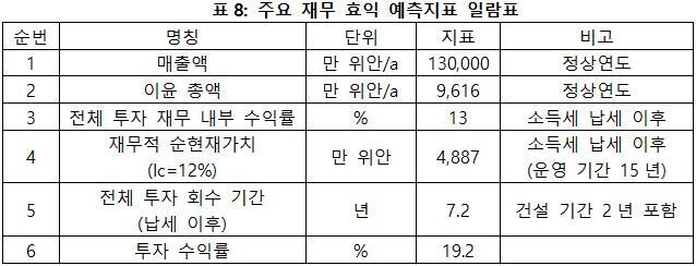 프로젝트가 설계 생산 능력의 생산량에 도달한 후 연간 매출액 130,000만 위안, 이윤 9,616만 위안, 투자 회수 기간 7.2년(납세 이후, 건설 기간 2년 포함), 투자 수익률은 19.2%이다.