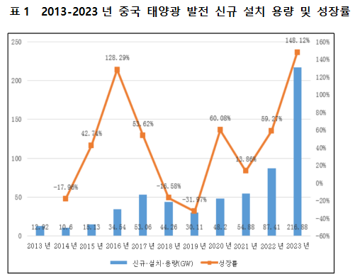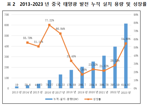 국가에너지국 데이터에 따르면, 2023년 말 기준, 중국의 태양광 발전 누적 설치 용량은 614.07GW에 달했으며, 전년 동기 대비 54.6% 성장했다. 하지만 이 수치는 2013년에 단지 19GW에 불과했으며, 2013-2023년 연평균 복합 성장률은 42.92%에 달했다. 태양광 발전 산업은 국가 전략과 시장 수요의 공동 작용 하에 번성하는 발전 추세를 보이고 있다.