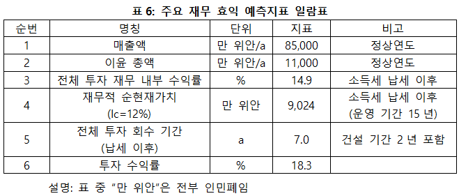 프로젝트가 설계 생산 능력의 생산량에 도달한 후 연간 매출액 85,000만 위안, 이윤 11,000만 위안, 투자 회수 기간 7.5년(납세 이후, 건설 기간 2년 포함), 투자 수익률은 18.3%이다.