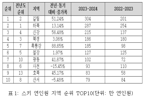 스키 연인원의 전년 동기 대비 증가폭을 보면, 상위 10개 성(省份) 중에서 흑룡강성, 신장, 길림성의 증가폭이 각각 88.65%, 56.48%, 51.24%로 상위 3위를 차지했다. 다른 도시들과 비교할 경우, 해당 지역은 고도 요인으로 인해 스키 시즌이 길고 현지 정부의 관광 정책, 스키장 등이 관광객 유치에 뚜렷한 성과를 거두었다.