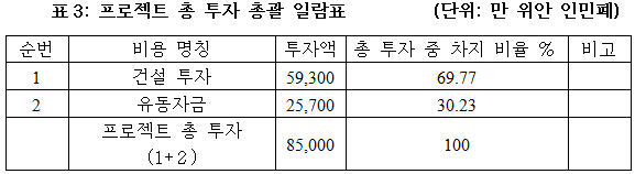 프로젝트의 총 투자는 85,000만 위안이며, 그 중 건설 투자가 59,300만 위안, 유동자금이 25,700만 위안이다.